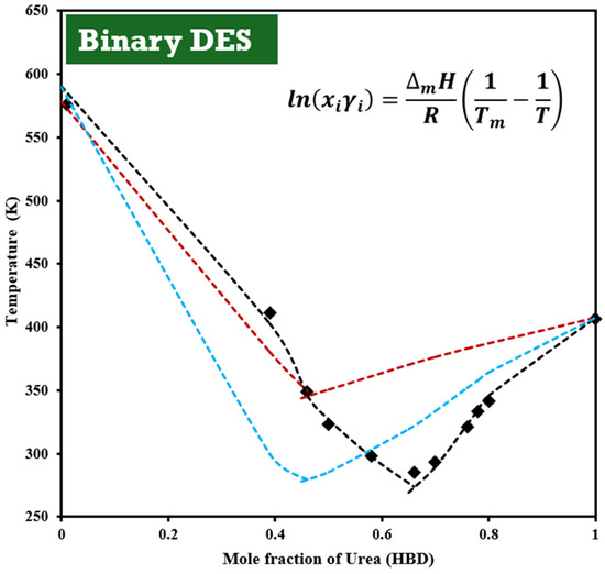Solid–liquid phase diagram of mixtures composed of ChCl + urea as a function of urea mole fraction. Experimental data [19] are represented by (■). Dashed lines indicate the phase equilibria calculated using Equation (2): red line for the ideal solution model, black line for the NRTL model with temperature-dependent parameters, and blue line for the NRTL model without temperature dependency. The ChCl:U (1:2) composition corresponds to the eutectic point of the deep eutectic solvent (DES) used in this study.