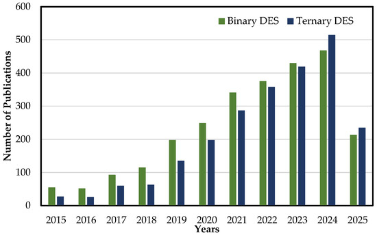 Number of publications throughout 2015–2025 from Scopus database search for articles with topics of “Binary Choline Chloride-based deep eutectic solvents” and “Ternary Choline Chloride-based deep eutectic solvents” [78].