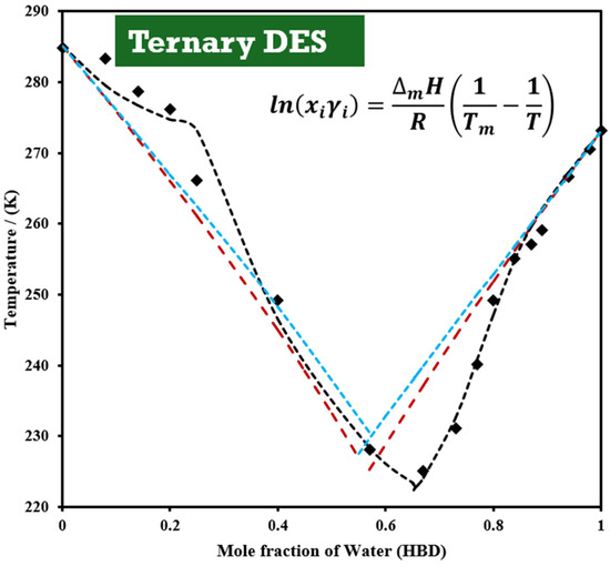 Solid–liquid phase diagram of a TDES system composed of DES (ChCl:U at 1:2 molar ratio) and water, as a function of water mole fraction. Experimental data [134] are represented by (■). Dashed lines indicate the phase equilibria calculated using Equation (2): red line for the ideal solution model, black line for the NRTL model with temperature-dependent parameters, and blue line for the NRTL model without temperature dependency.