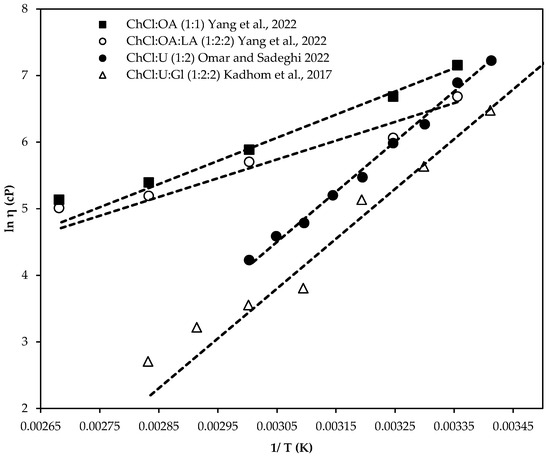 - Al-Dawsari, J.N.; Bessadok-Jemai, A.; Wazeer, I.; Mokraoui, S.; AlMansour, M.A.; Hadj-Kali, M.K. Fitting of Experimental Viscosity to Temperature Data for Deep Eutectic Solvents. J. Mol. Liq. 2020, 310, 113127. [Google Scholar] [CrossRef]