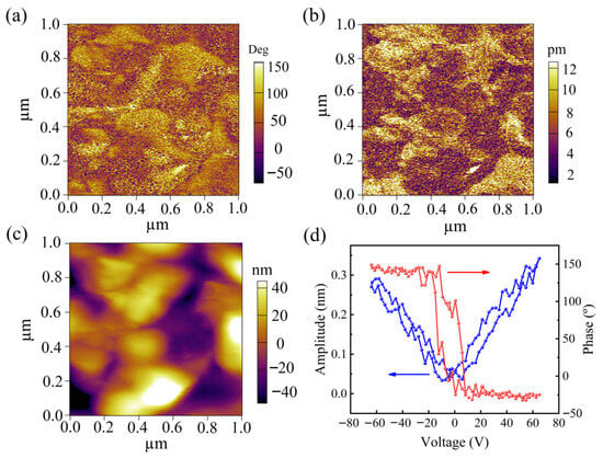 (a) PFM phase image. (b) PFM amplitude image. (c) PFM topography image. (d) Amplitude butterfly and phase hysteresis loops.