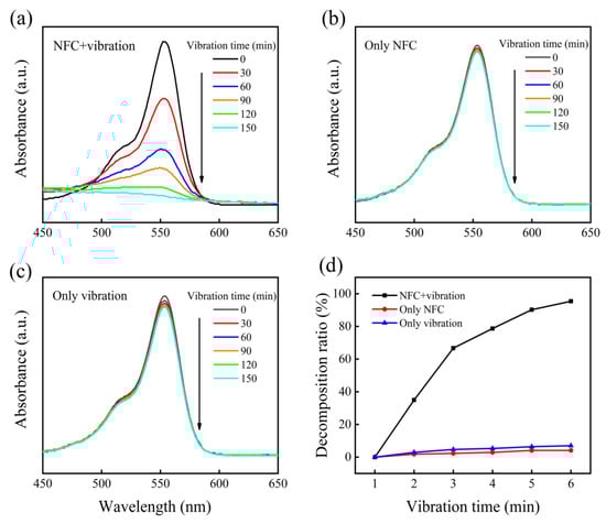 The absorption spectra of RhB under different conditions. (a) Catalyst and vibration. (b) Only catalyst. (c) Only vibration. (d) The decomposition curve of RhB over various reaction conditions.