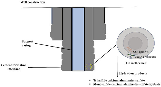 A crucial phase in the building of any well is cementing. It entails adhering the well casing to the surrounding geological structure by placing cement slurry between them. In addition to sealing off intricate formations and preventing the unintended movement of water, gas, and oil, this covering gives the casing structural strength [1,2]. Strong corrosion resistance is required of the cement slurry in wells containing CO2 [3]. The main constituents of oil well cement is tricalcium silicate (C3S), dicalcium silicate (C2S), tricalcium aluminate (C3A), and tetra calcium aluminoferrite (C4AF). These constituents hydrate to generate calcium hydroxide (CH) and calcium silicate hydrate (CSH), which are important sources of alkalinity and strength [4]. In acidic conditions, the cement is vulnerable to corrosion caused by CO2 because of the high alkalinity caused by CH [5]. When these substances are hydrated, they yield the alkaline CH and CSH [5]. These alkaline chemicals readily react with the acidic fluids produced by CO2, which weakens the cement’s mechanical properties. Cement high alkalinity, which is caused by the copious amounts of CH that are created during hydration, makes it more vulnerable to acid-induced corrosion, which raises the possibility of integrity loss and leaking within the well structure (see Figure 1).