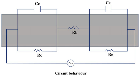 The electrical impedance of cement and treated cement was measured in order to examine their electrical characteristics. The impedance properties of the treated cement were evaluated through the utilization of alternating current (AC) measurements. The findings provide insights into the disparities in electrical impedance observed between cement samples that have undergone treatment and those that have not. Impedance spectroscopy was measured using the two-probe technique with AC [46,47]. For AC measurements over a wide range of frequencies, an LCR meter (E4980A, Keysight Technologies, Santa Rosa, CA, USA) with 0.01U precision was employed. This LCR meter is capable of both low and high ranges of impedance. Panda et al. [48] provided insight into the equivalent electrical circuit of the composite material behavior (see Figure 2). If the material’s bulk capacitance (Cb) is ignored, the overall impedance of the corresponding circuit is calculated using Equation (3).