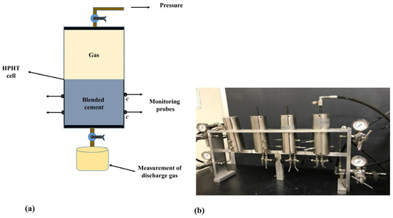 The fluid loss test was conducted using a high-pressure, high-temperature apparatus constructed from steel. Furthermore, the apparatus is equipped with grooves to facilitate the measurement of electrical resistivity. The resistance during the 30 min fluid loss test was measured by the modified cell. The measuring cell possesses a diameter of 5 cm, accompanied with a maximum volume of 500 cm3. The LCR was employed for the purpose of quantifying the vertical resistance shown by cement slurry in the context of fluid loss testing. The alteration in resistance was then associated with variations in resistivity. High-purity experimental-grade nitrogen gas was used as it is relatively inert and does not have harmful health effects. Moreover, the application of nitrogen gas is advantageous due to its non-reactivity with cement. The alteration in resistivity was noticed through the act of opening the output valve. The application of gas pressure leads to fluid depletion, resulting in the construction of a cohesive network of pores, which subsequently leads to the occurrence of gas leakage. This phenomenon replicates the characteristics exhibited by gas leaks in a downhole environment. The pressure applied following the blow-out event was consistently maintained at a fixed value of 100 pounds per square inch (psi) for a duration of 30 min. For the fluid loss test of all specimens, different cement slurries of 315 cm3 in volume were prepared and poured into the cell as shown in Figure 3. The purpose of fluid test is to arrive at the resilience of cement slurry to applied pressures.