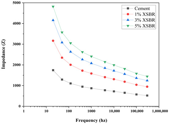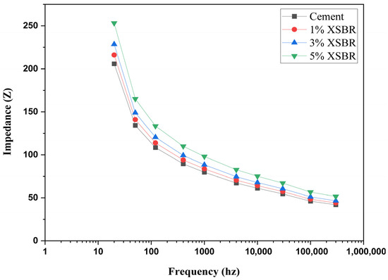 The electrical impedance of cement and cement treated with XSBR was assessed, and the corresponding results are presented in Figure 4 and Figure 5. To investigate the impact of XSBR content on the electrical properties of cement, AC measurement was employed. The obtained data demonstrate the variations in electrical impedance for cement samples incorporating different amounts of XSBR at two specific curing periods, namely, 24 h and 28 days. The increased polymer content raises the cement medium’s conductivity, lowering the impedance. In contrast, the impedance increases as the polymer percentage drops due to less ionic mobility and fewer conductive routes in the cement treated with the polymer. As the frequency of the polymer-treated cement blends increases, the electrical impedance reduces due to the minimized contact resistance.