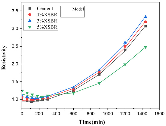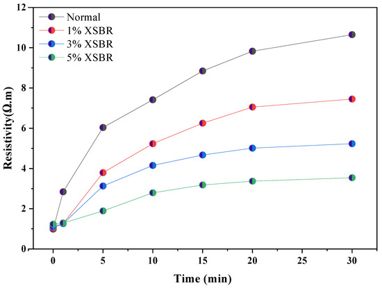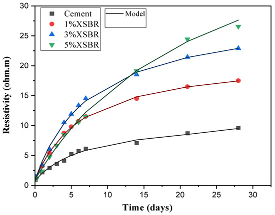 As stated by Barluenga and Hernández [28], the inclusion of hydrophilic compounds derived from SBR in concrete has been found to enhance its workability and promote the entrapment of air, hence reducing the movement of cement particles. The determination of the mechanism by which SBR latex enhances fluidity and the need for further investigation on cement treated with polymers are both important aspects to consider. SBR latex, which is recognized for its inherent hydrophobic properties, introduces the formation of bubbles within the mixture [31]. Furthermore, the carboxylate groups of styrene–butadiene particles can form chelates with calcium ions that are found in the pore solution [32]. Numerous scholars have conducted investigations on the impact of polymer incorporation into cement, examining various aspects such as mechanical characteristics and hydration through the utilization of standardized testing methods [33,34,35]. The major factor chosen for identifying changes in polymer-treated cement is electrical resistivity. The attribute in question is unaffected by the size of the sample and offers valuable insights about the behavior of the material across various phases of the curing process. This research examines the behavior of XSBR cement slurry at different phases of curing through the utilization of electrical resistivity. The findings of this study have the potential to be applied in areas such as soil grouting and the sealing of leaky oil and gas wells.