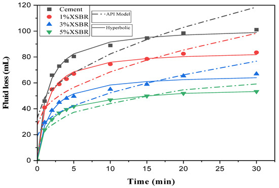Polymer is added to the cement mixture to prevent fluid loss, and it also supports the matrix in other ways too. When added to cement, XSBR minimizes fluid loss. Fluid loss for polymer-treated cement without and with XSBR was 118.6 mL, 98.3 mL, 76.8 mL, and 59.2 mL, respectively, for additions of 0%, 1%, 3%, and 5% XSBR (see Table 2). From Figure 8, it was found that addition of XSBR reduced the fluid loss for polymer-treated cement, which decreased by 17%, 33%, and 48% by addition of 1%, 3%, and 5% XSBR content. Reduction in fluid loss indicates that the styrene–butadiene polymer fills the pores of the cement slurry. Additionally, the fluid loss of the samples was modeled using an API model.