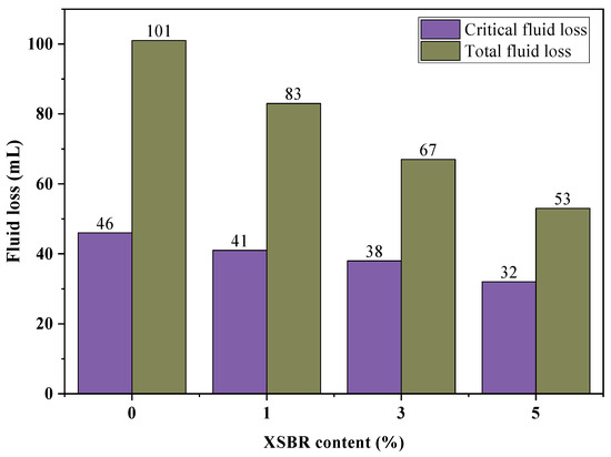 The term “critical fluid” refers to the complete loss of fluid that occurs just prior to the detection of a gas leak. The experiments conducted to determine the critical fluid loss values for different polymer additions (0%, 1%, 3%, and 5%) yielded results of 46 mL, 41 mL, 38 mL, and 32 mL, respectively. These values correspond to a total fluid loss of 101 mL, 83 mL, 67 mL, and 53 mL, as depicted in Figure 9. The trend observed in the ratio of the critical fluid loss to the total fluid loss indicated an increase with increasing polymer loading. Specifically, the values for this ratio were found to be 0.45, 0.49, 0.56, and eventually reaching 0.60 at a polymer loading of 5%. The observed upward trend in the percentage values indicates the impact of polymer materials in enhancing resistance to gas leakage.
