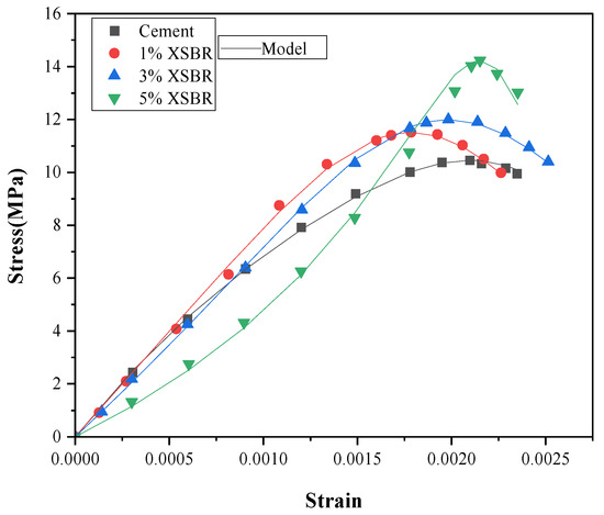 Compressive stress–strain curves for 28-day cured polymer-treated cement specimen.