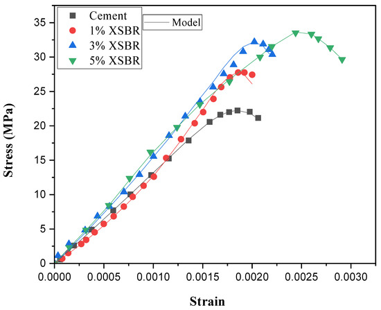 As the duration of the curing period is extended, there is an increase in the occurrence of cementations within the mixtures, leading to the formation of cementitious products with enhanced strength. This principle is applicable to all polymer constituents. In addition, the application of hydration XSBR polymer to cement has the potential to effectively seal macropores. The effect of plugging macropores resulted in a decrease in the penetrability of the final cement paste. In addition, it is worth noting that the CSH gel formed during the process of cement hydration exhibited porosity. Moreover, the observation of a smaller pore size in the gel indicated a decrease in the quantity of fractals as the duration of curing progressed. The stress–strain outcomes depicted in Figure 12 provide evidence for this assertion. As an illustration, the peak compressive stress values for curing times of one day and 28 days were found to be 12.02 MPa and 31.89 MPa, respectively, when the polymer proportion in the blend was 3%.
