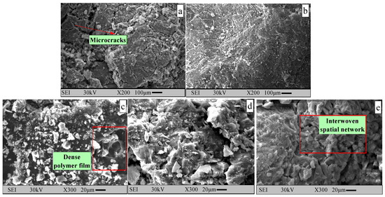 Scanning electron microscopy (SEM), which examines the microstructural alterations in cement treated with XSBR, supported the findings. The SEM data are shown in Figure 13, which clearly illustrates the mixtures’ shape. Figure 13a shows that the pure cement sample, after hydration, has a more open microstructure and no thick filler material. Furthermore, the cement paste exhibits noticeable microcracks, some more comprehensive than 1–3 μm, which may be a factor in the material’s reduced strength.