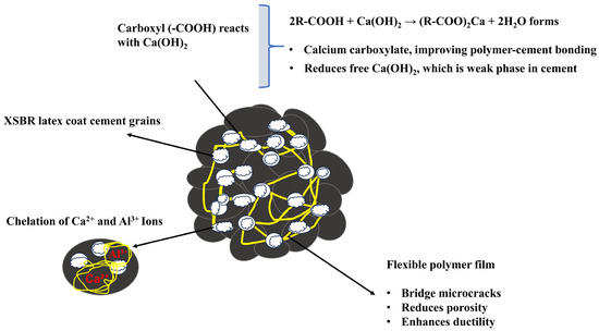 Due to its versatile characteristics, latexes are widely used as adhesion promoters. According to the cited source, the utilization of flexible cement designs has the potential to effectively mitigate the occurrence of cracks. The enhancement of the anti-channeling power of cement slurry, the improvement in the bonding between cement and casing, and the reduction in permeability have been observed [21]. Styrene butadiene polymer (SBR) is extensively employed in the process of oil well cementing because of its exceptional mechanical characteristics, capacity to diminish cement shrinkage, and ability to minimize fluid loss through the coalescence of SBR particles [17,22]. To enhance the adhesive characteristics of SBR, carboxylate functional groups in latex emulsions are reacted with a highly acidic monomer [23]. There has been a recent surge in interest in the incorporation of functional polymer additives into cement, as evidenced by several studies [24,25,26]. Bauregger et al. [27] conducted a study on cement hydration, wherein they observed that the presence of styrene–butadiene inhibits the processes comprising silicate and aluminate compounds.