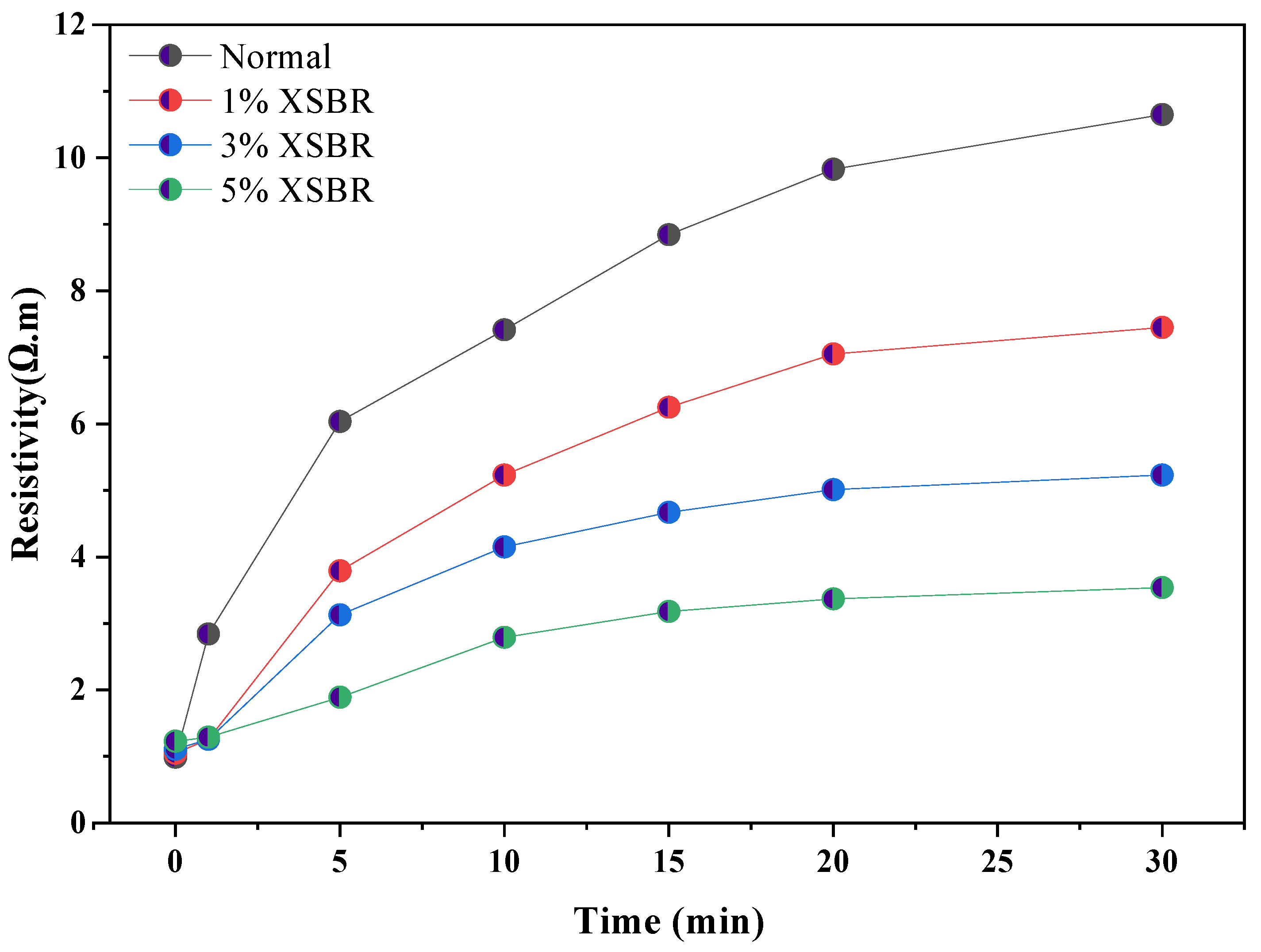 | XSBR Content (%) | Density (g/cm3) | Initial Resistivity | Initial Resistivity Variation | Minimum Resistivity | Final Resistivity | Resistivity Index | |