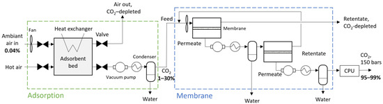 Surprisingly, the possibilities of hybrid systems are largely unexplored. Given the very high dilution level of the starting CO2 concentration for DAC (i.e., 400 ppm) and the target purity level (typically 90% or above), it is likely that the combination of two distinct separation processes could be of interest. Adsorption processes are known to offer high performance for diluted feeds, but reaching high purity systematically translates into increased cost and specific energy. Membrane processes are often considered as inappropriate for diluted feeds and can hardly compete with adsorption for DAC [22,27]. Membrane separation is, however, of major interest for moderate to concentrated CO2 feeds (i.e., 15 to 50% or above) in terms of energy efficiency and cost. Based on this statement, the combination of an adsorption pre-concentration step and a membrane CO2 final concentration unit is proposed in this study. The feasibility of such hybrid DAC was introduced by Huang et al. [29]. To our knowledge, no study has investigated up to now the separation performance, energy efficiency, and overall cost of such a hybrid process for DAC. The objective is to evaluate the potentialities and limitations of the concept through a preliminary set of parametric simulations. State-of-the-art solutions for carbon capture by sorbents and membranes are thus explored in order to analyze their association in a two-step process.
