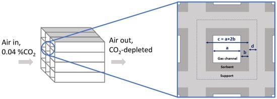 Because of the potential for the monolithic geometry to reduce the pressure drop of air across the bed, the design is considered to be a hypothetical structured adsorbent bed (i.e., monolithic sorbent with squared channels, Figure 2). The sorbent is coated on a support considered to be stainless steel [44]. The characteristic dimensions of the monolith are given in Table 3. Considering this geometry, the specific surface area of the adsorbent is given by , fixed at 907 m2/m3; the active bed volume voidage is given by , equal to 0.39; the bed volume voidage is given by , equal to 0.23; the sorbent bulk density is 281 kg/m3; and the inlet interstitial gas velocity is calculated as .