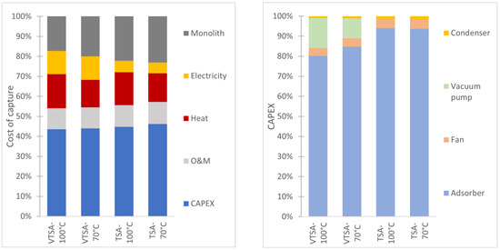 The cost of capture is high for the four cases, ranging from 1630 €/tCO2 to 1991 €/tCO2, and should be highlighted with CO2 outlet purity. As can be seen on the left in Figure 5, the cost of capture follows a near 50/50 repartition between capital investment (CAPEX) and OPEX. The monolith (i.e., sorbent coated on support), through cost assumptions, represents a large part of the cost of capture (about 20%). Because of the vacuum pumping, the electricity share is larger for the VTSA cases. The right of Figure 5 shows that the adsorber, including the vessel pair, distributors, packing supports, valve skid, and heater (and excluding the monolith cost), represents the main part of CAPEX, meaning that a reduction in capital cost should be targeted first based on the adsorber cost.