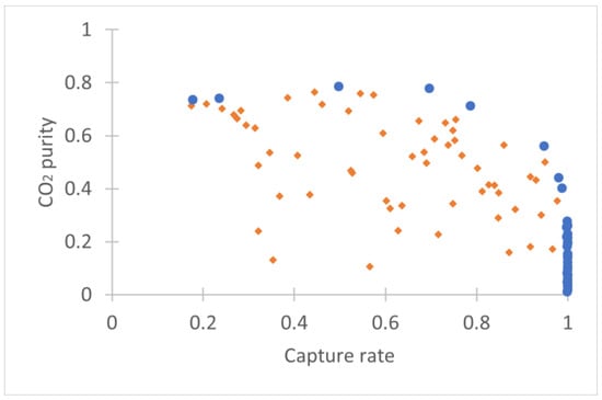 Pareto front (blue dots) on outlet CO2 purity and capture rate of the membrane step for the TSA-70 °C case. Blue dots are the non-dominated points (that are optimal) and orange diamonds are dominated points (that respect the constraints but are not optimal).