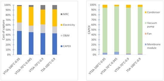 (Left): Distribution of the cost of capture on capital cost, O&M, electricity, and MRC for the membrane step. MRC: membrane replacement cost. (Right): Distribution of the capital cost for the equipment in the membrane step. The names of cases on the x-axis refer to the type of regeneration—regeneration temperature—outlet CO2 purity.