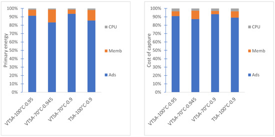 In order to evaluate an adsorption–membrane hybrid process, different cases using TSA or VTSA regeneration are evaluated. These cases are composed of four different adsorption cases followed by membrane separation. The four adsorption cases, summarized in Table 7, are based on the regeneration process (TSA or VTSA) and regeneration temperature (70 °C or 100 °C).