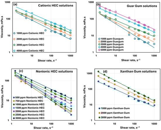 Rheological behavior of polymer solutions. (a) Cationic HEC solutions, (b) Guar gum solutions, (c) Nonionic HEC solutions, and (d) Xanthan gum solutions.