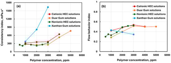 Comparison of power-law parameters of polymer solutions. (a) Consistency index, (b) flow behavior index.
