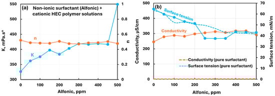 Influence of nonionic surfactant (Alfonic) addition to cationic hydroxyethylcellulose (CHEC) polymer solution. (a) Consistency and flow behavior indices, (b) conductivity and surface tension.