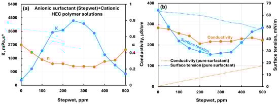 Influence of anionic surfactant (Stepwet) addition to cationic hydroxyethylcellulose (CHEC) polymer solution. (a) Consistency and flow behavior indices, (b) conductivity and surface tension.