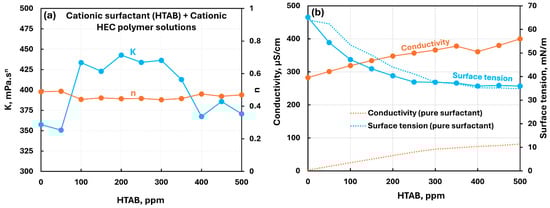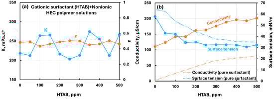Influence of cationic surfactant (HTAB) addition to cationic hydroxyethylcellulose (CHEC) polymer solution. (a) Consistency and flow behavior indices, (b) conductivity and surface tension.