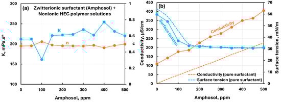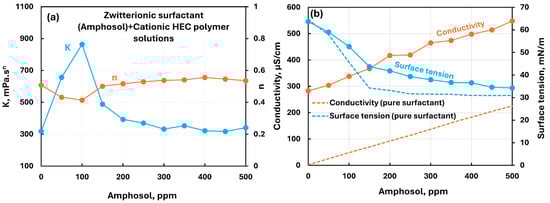 Influence of zwitterionic surfactant (Amphosol) addition to cationic hydroxyethylcellulose (CHEC) polymer solution. (a) Consistency and flow behavior indices, (b) conductivity and surface tension.