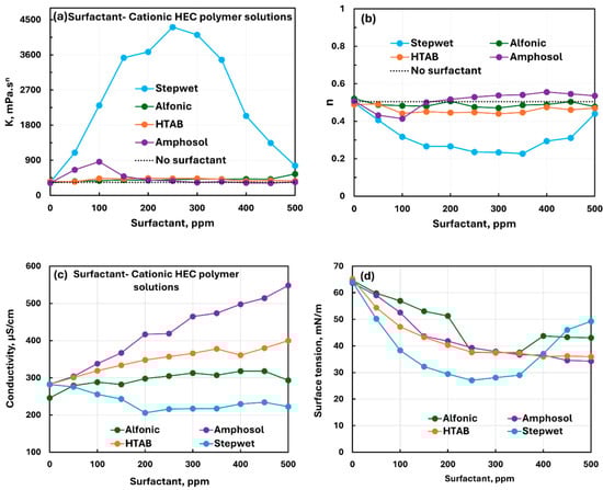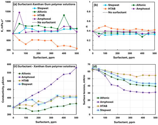 Comparison of the influence of different surfactants on the properties of surfactant-anionic polymer (xanthan gum) solutions. (a) Consistency index, (b) flow behavior index, (c) electrical conductivity, and (d) surface tension.