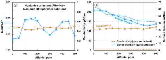 Influence of nonionic surfactant (Alfonic) addition to nonionic hydroxyethylcellulose (NHEC) polymer solution. (a) Consistency and flow behavior indices, (b) conductivity and surface tension.