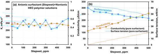 Influence of anionic surfactant (Stepwet) addition to nonionic hydroxyethylcellulose (NHEC) polymer solution. (a) Consistency and flow behavior indices, (b) conductivity and surface tension.