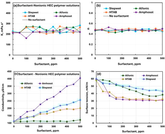 Comparison of the influence of different surfactants on the properties of surfactant–nonionic polymer (NHEC) solutions. (a) Consistency index, (b) flow behavior index, (c) electrical conductivity, and (d) surface tension.