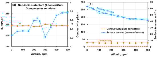 Influence of nonionic surfactant (Alfonic) addition to nonionic guar gum solution. (a) Consistency and flow behavior indices, (b) conductivity and surface tension.