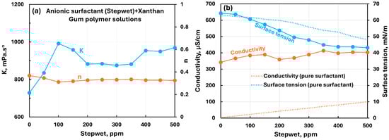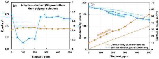 Influence of anionic surfactant (Stepwet) addition to anionic xanthan gum solution. (a) Consistency and flow behavior indices, (b) conductivity and surface tension.
