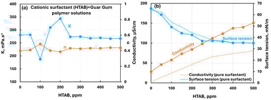 Influence of cationic surfactant (HTAB) addition to nonionic guar gum solution. (a) Consistency and flow behavior indices, (b) conductivity and surface tension.
