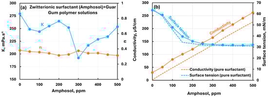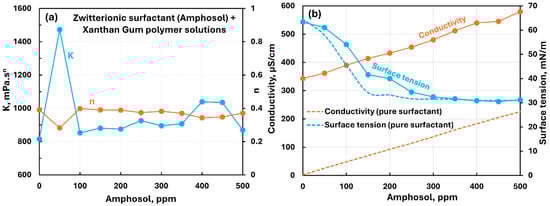 Influence of zwitterionic surfactant (Amphosol) addition to anionic xanthan gum solution. (a) Consistency and flow behavior indices, (b) conductivity and surface tension.