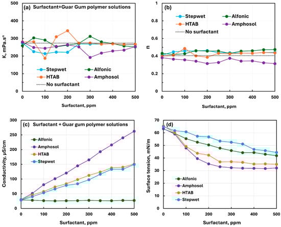 Comparison of the influence of different surfactants on the properties of surfactant–nonionic polymer (guar gum) solutions. (a) Consistency index, (b) flow behavior index, (c) electrical conductivity, and (d) surface tension.