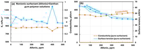 Influence of nonionic surfactant (Alfonic) addition to anionic xanthan gum solution. (a) Consistency and flow behavior indices, (b) conductivity and surface tension.