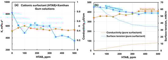 Influence of cationic surfactant (HTAB) addition to anionic xanthan gum solution. (a) Consistency and flow behavior indices, (b) conductivity and surface tension.