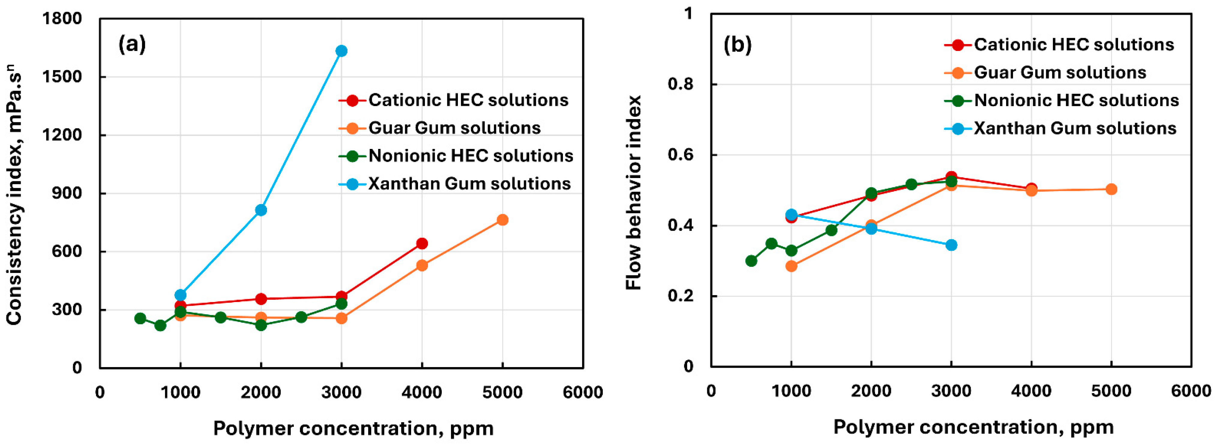 Polymer | Concentration (ppm) | K (mPa.s n) | n | R2 |