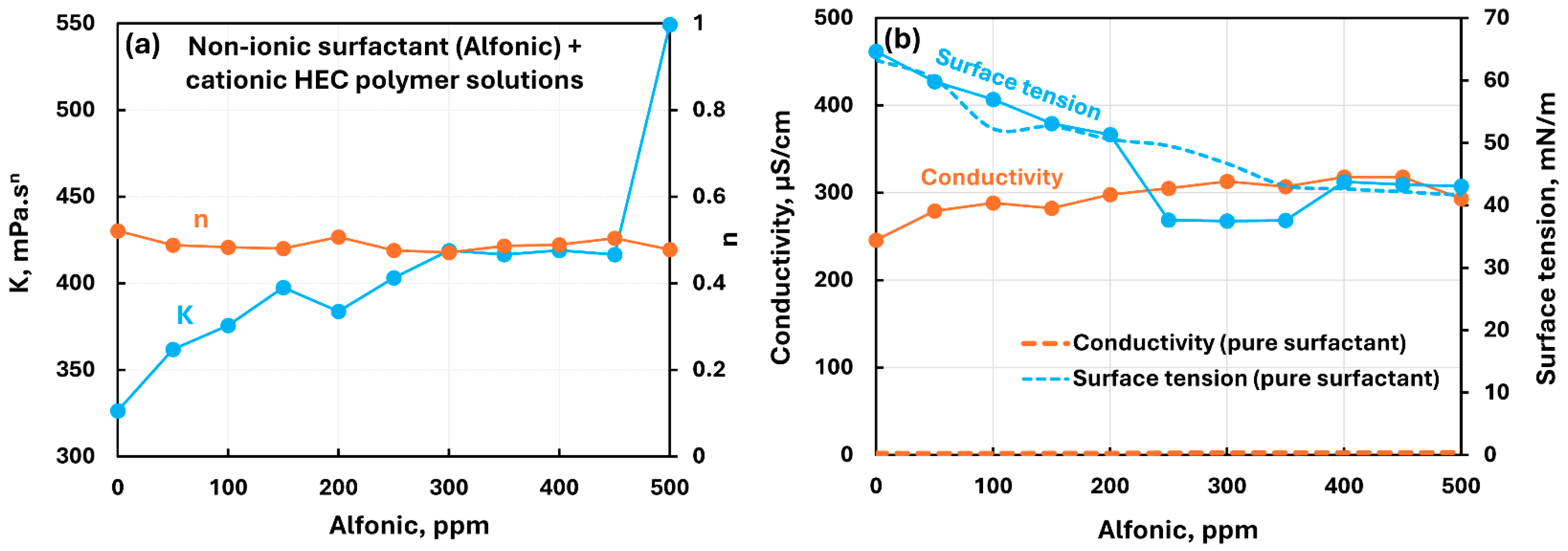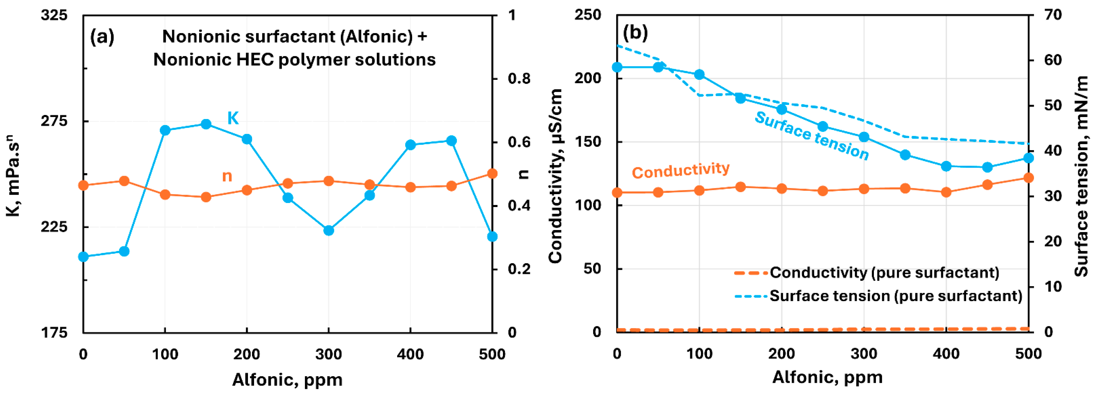 Nonionic hydroxyethyl cellulose (NHEC) | Nonionic (Alfonic) | S0 P0 | Mild hydrophobic interaction between surfactant and polymer; consistency fluctuates; solution surface tension lower than pure surfactant; surfactant–polymer complexes formed are more surface-active than pure surfactant. |