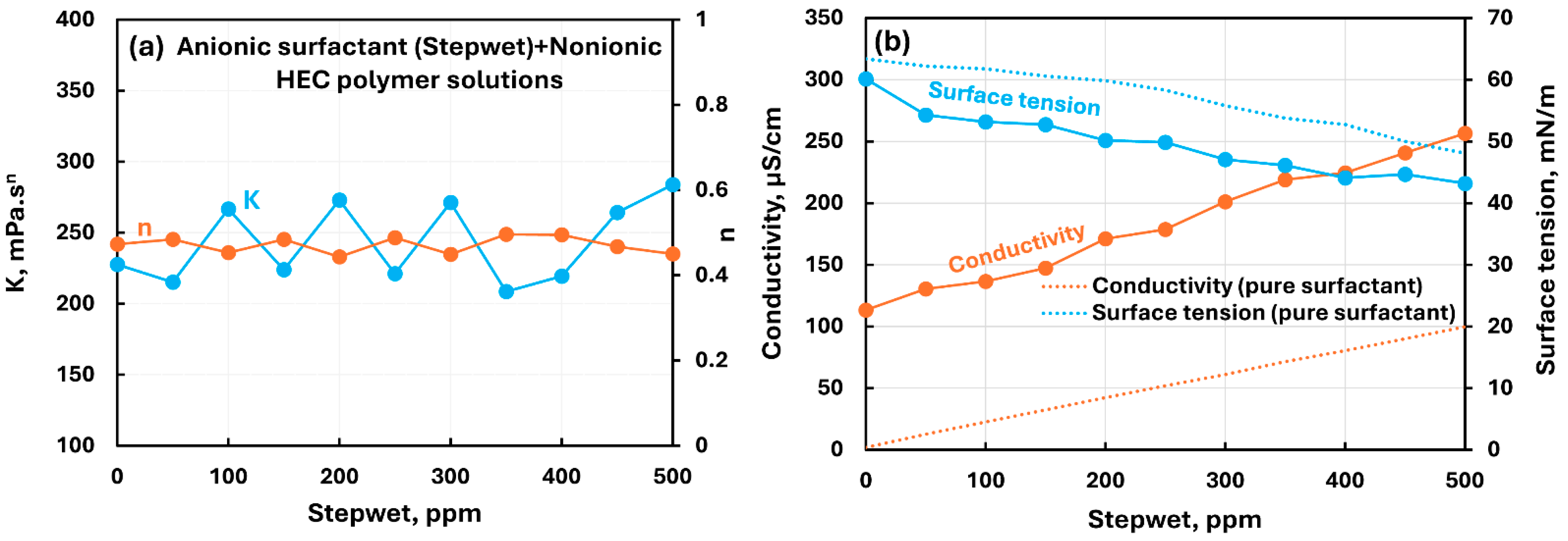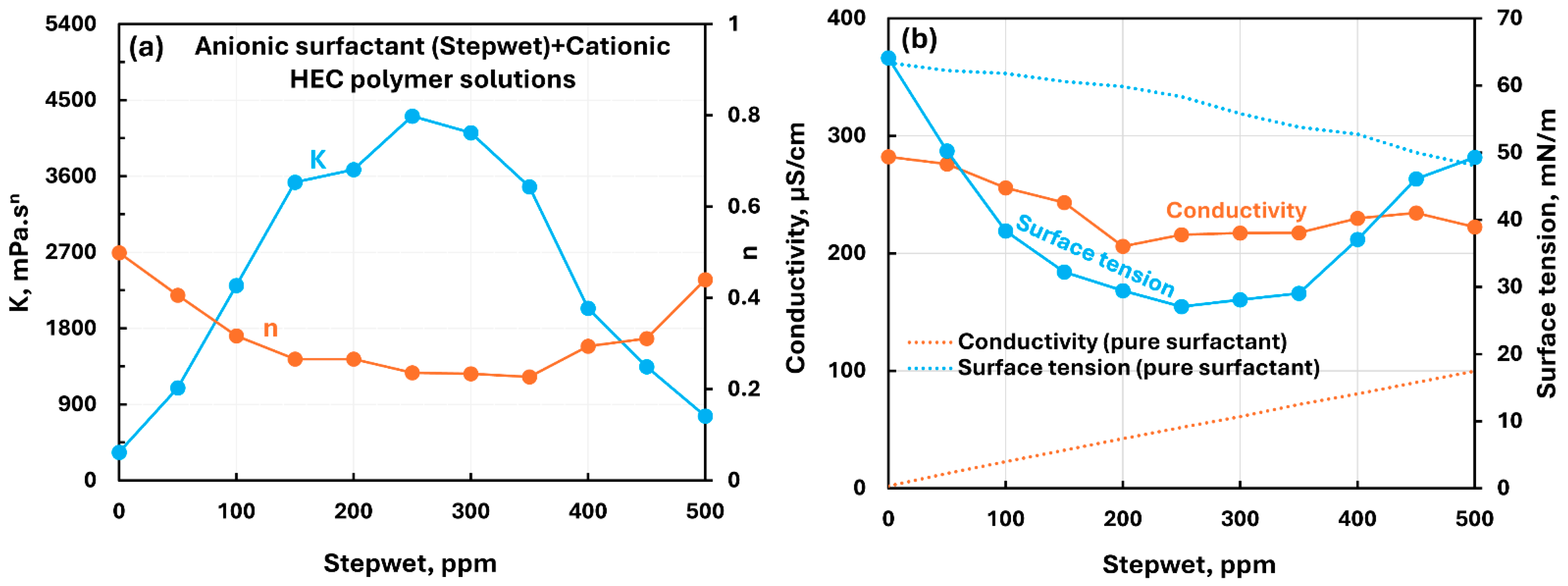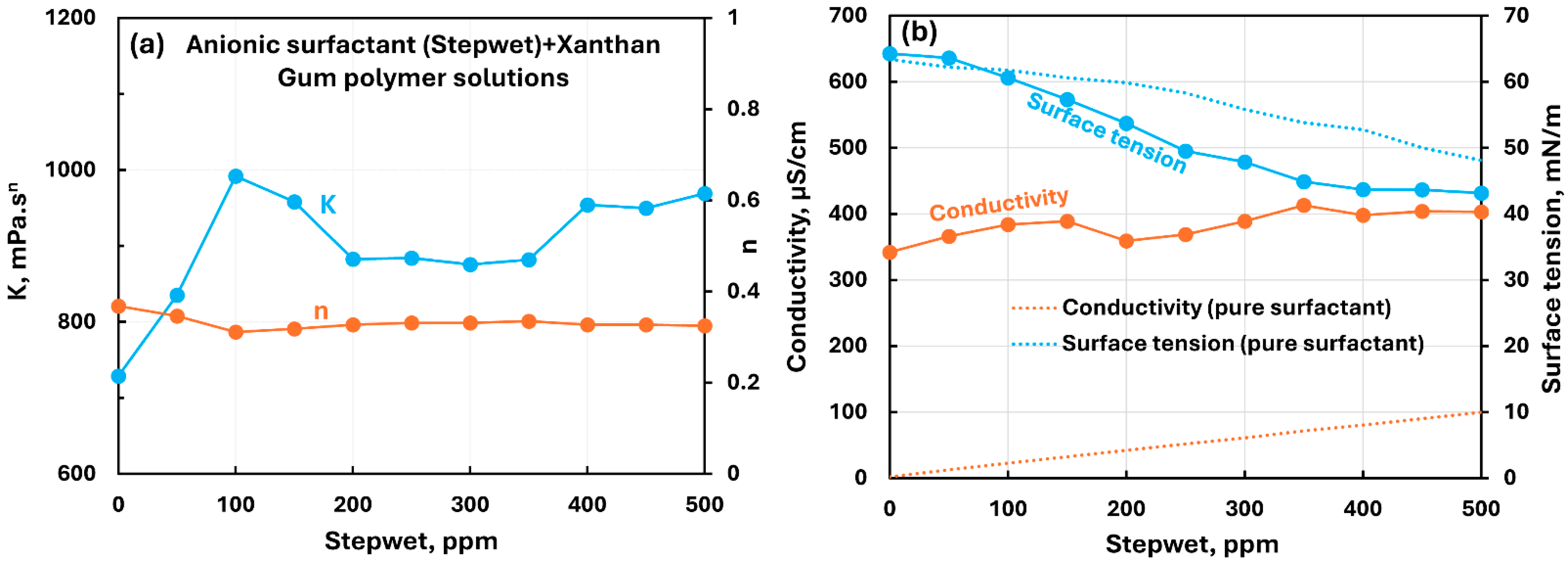 Anionic Xanthan Gum | Anionic (Stepwet) | S− P− | Moderate electrostatic interaction between surfactant and polymer; consistency index increases significantly; Surfactant interacts with polymer to forms complexes which are more surface-active than pure surfactant. |