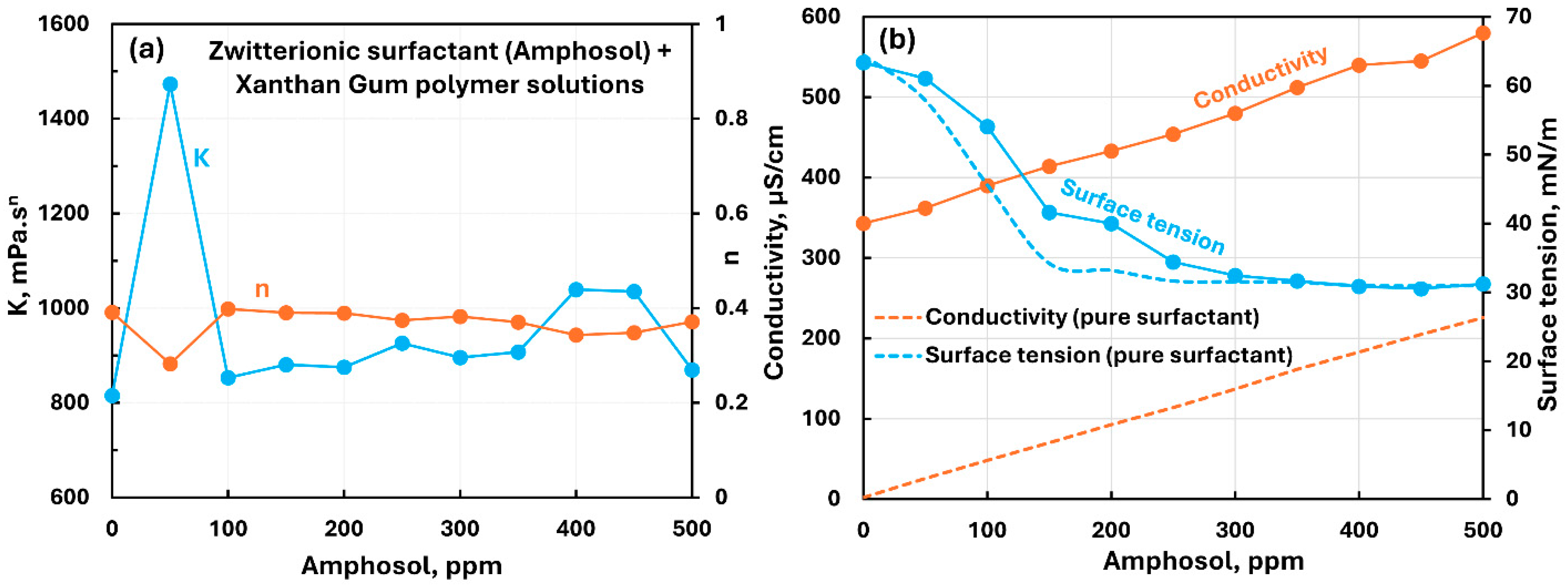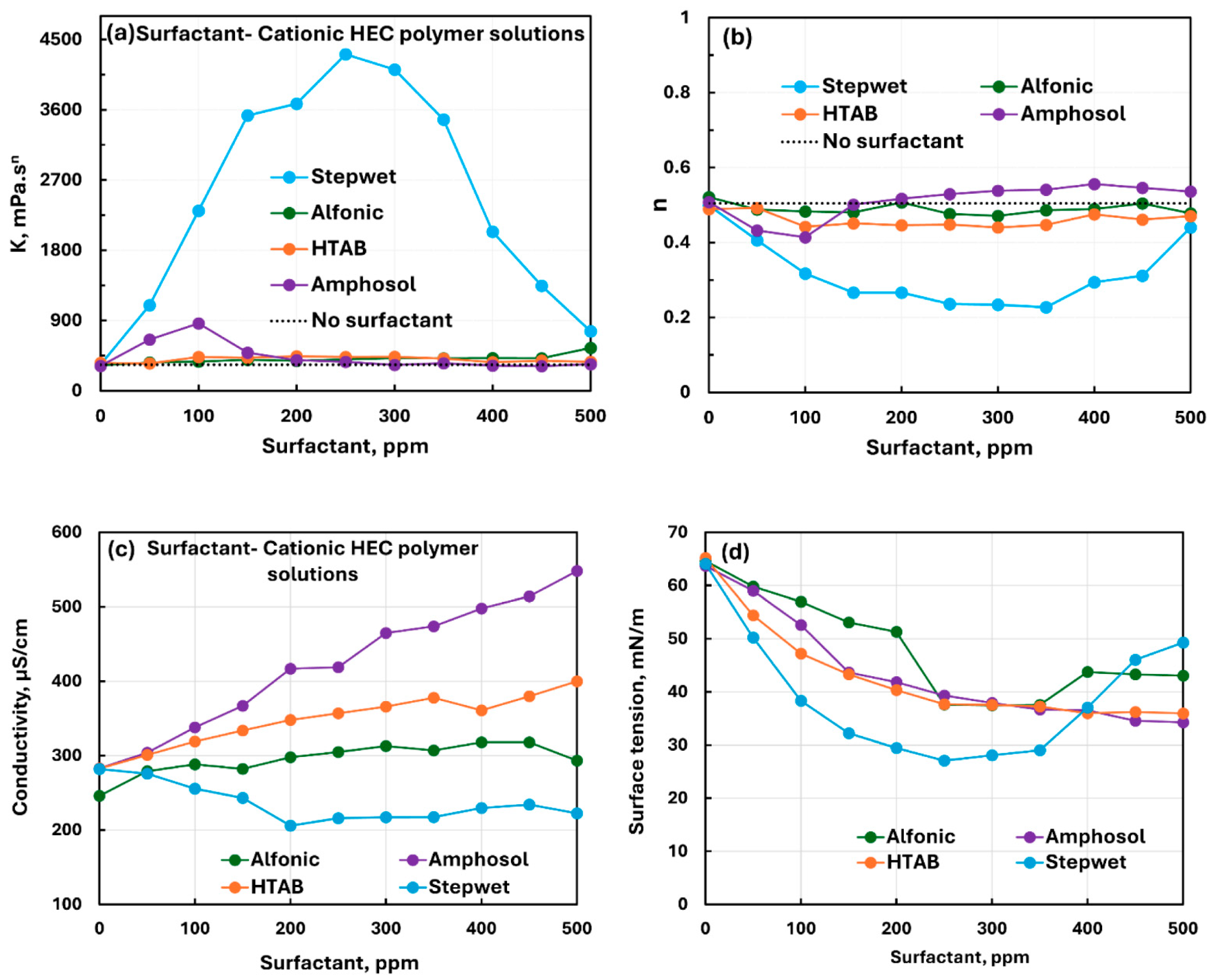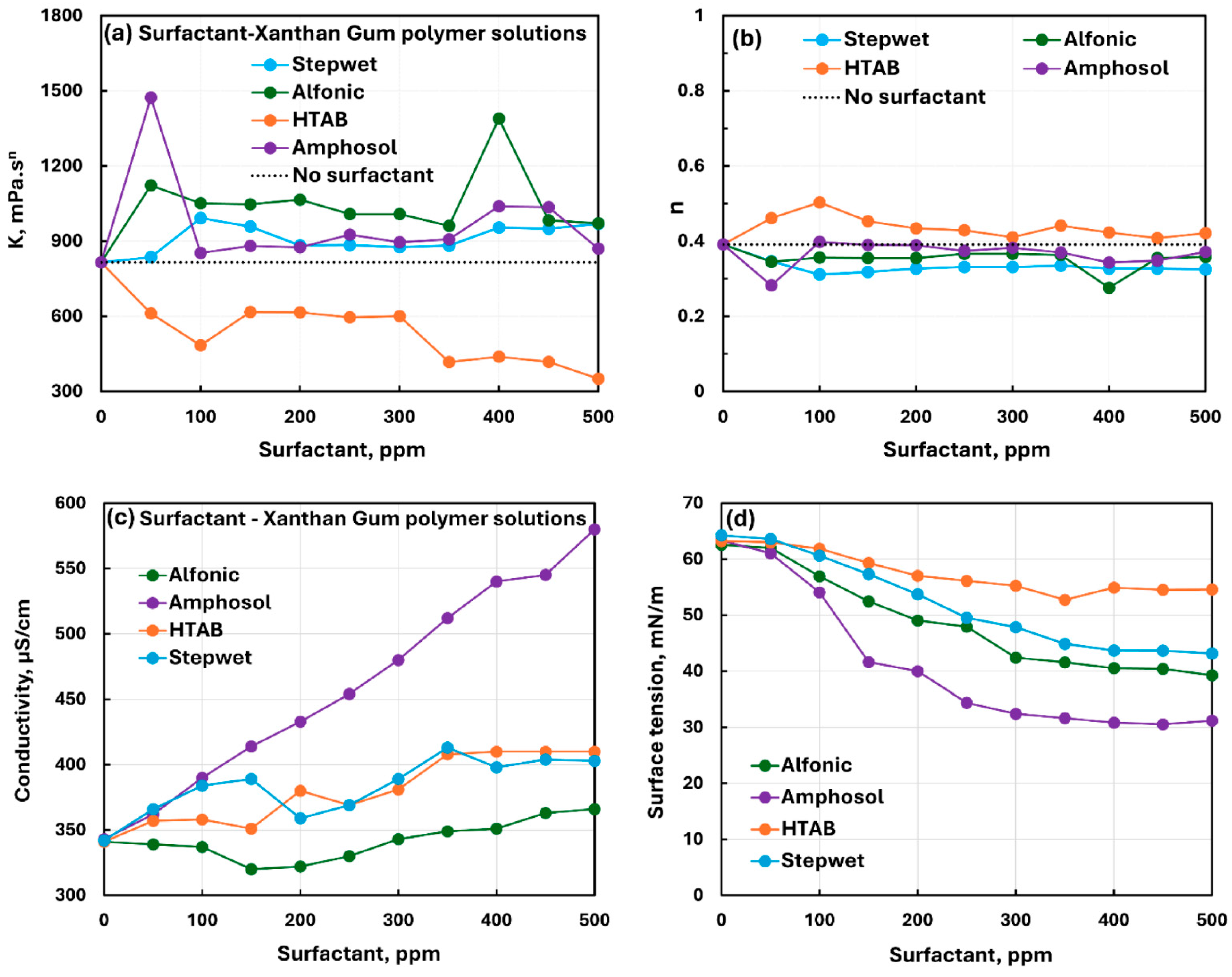 Anionic Xanthan Gum | Anionic (Stepwet) | S− P− | Moderate electrostatic interaction between surfactant and polymer; consistency index increases significantly; Surfactant interacts with polymer to forms complexes which are more surface-active than pure surfactant. |