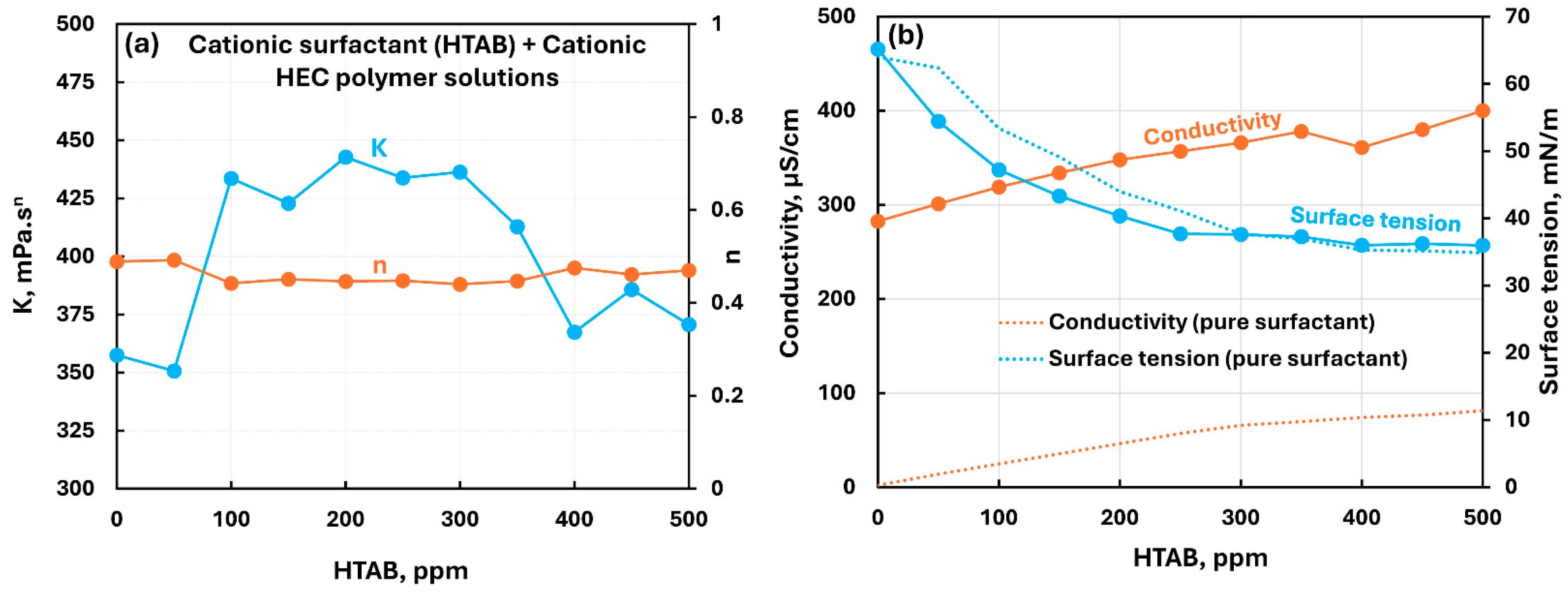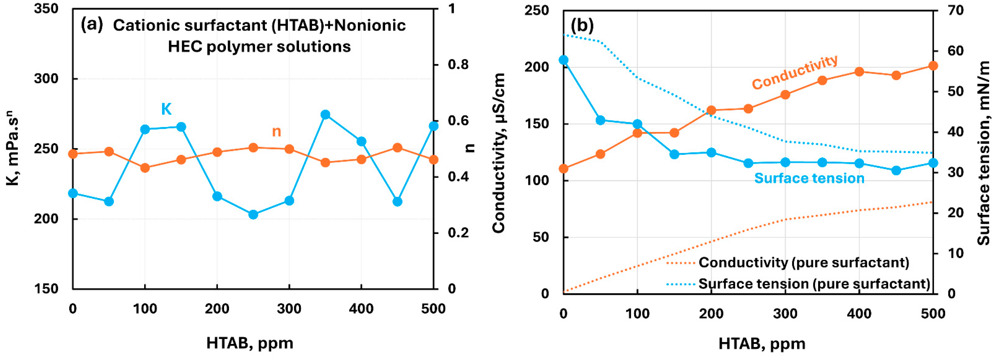Nonionic hydroxyethyl cellulose (NHEC) | Cationic (HTAB) | S+ P0 | Mild hydrophobic interaction between surfactant and polymer; minor changes in consistency; solution surface tension lower than pure surfactant due to surface activity of polymer itself; no unambiguous evidence of formation of surfactant–polymer complexes. |