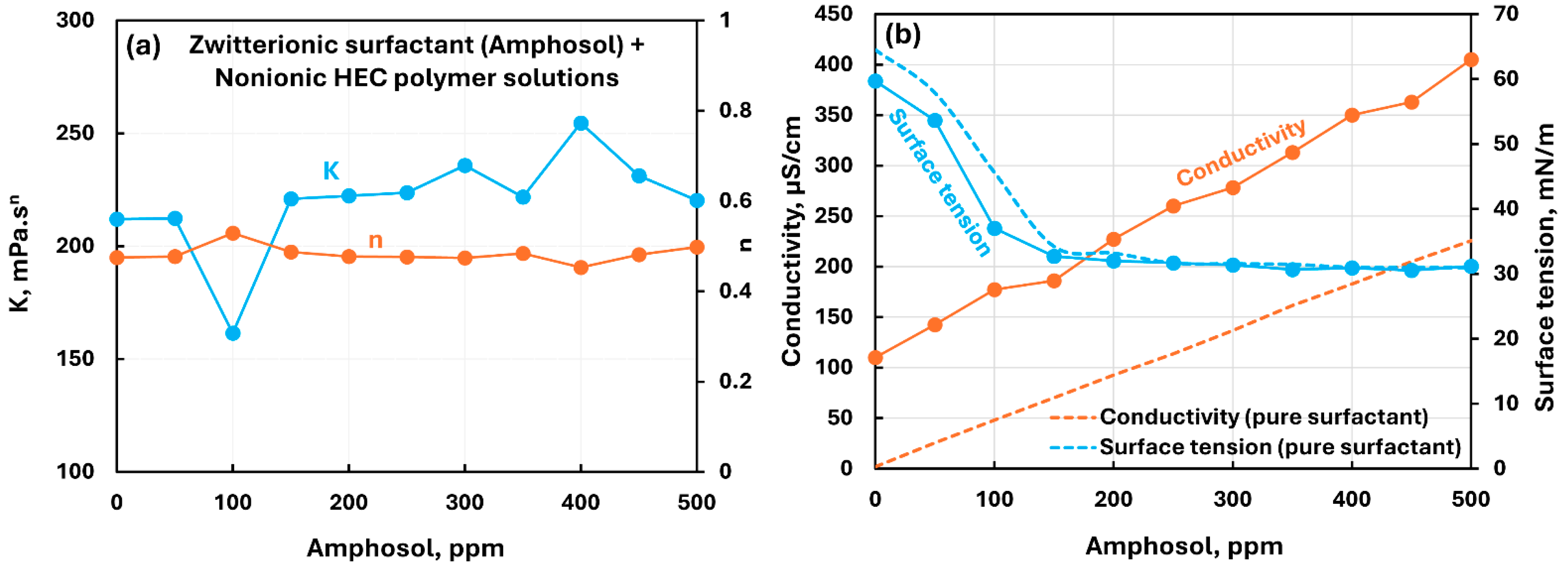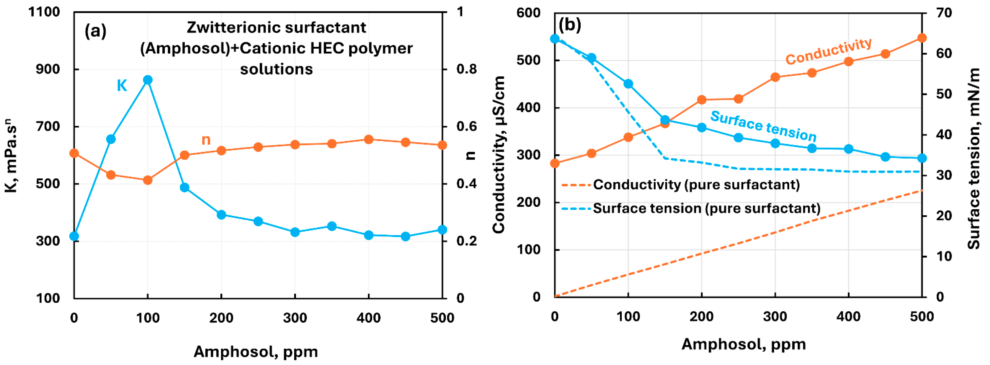 Nonionic hydroxyethyl cellulose (NHEC) | Zwitterionic (Amphosol) | S+− P0 | Weak hydrophobic interaction between surfactant and polymer; consistency fluctuates; no unambiguous evidence of formation of surfactant–polymer complexes. |