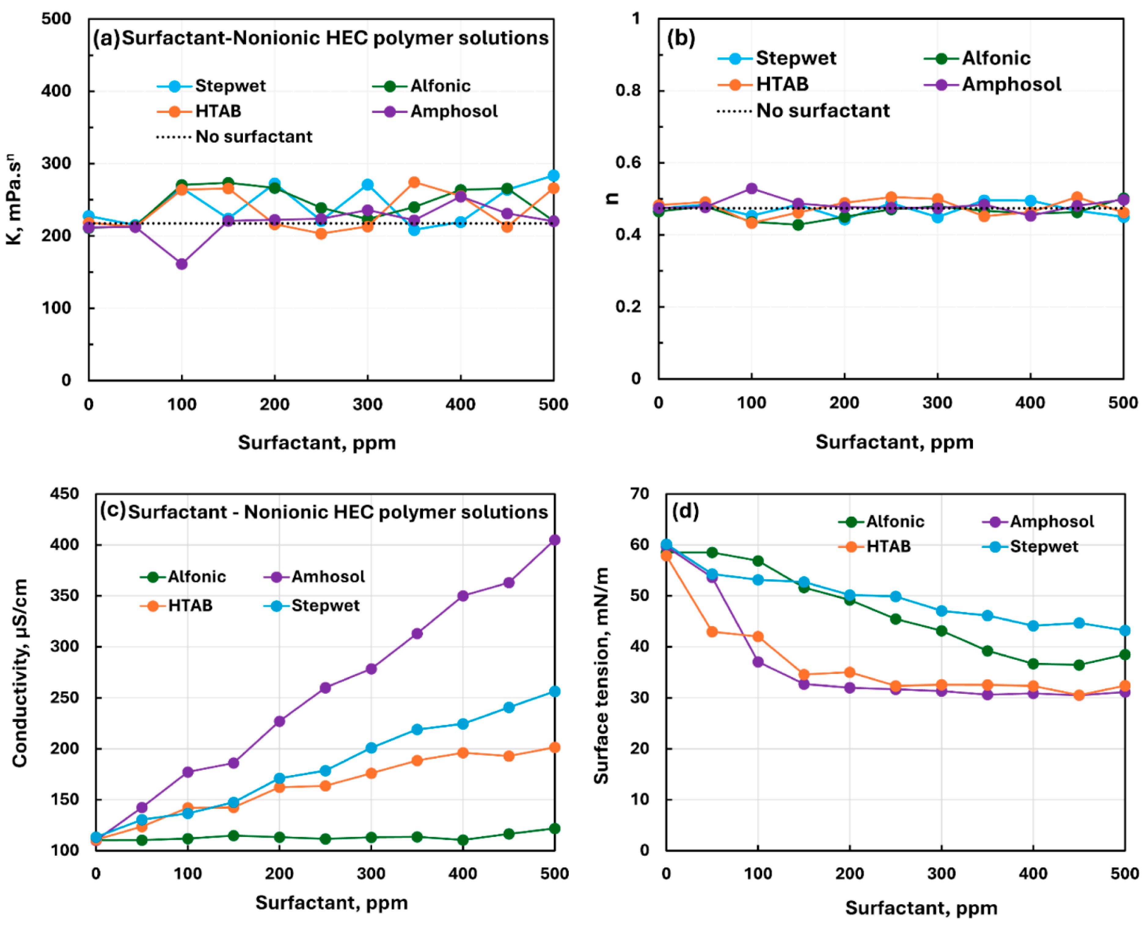 - The nonionic hydroxyethyl cellulose (NHEC) polymer exhibits weak to mild interactions with the surfactants investigated. The consistency index either varies to a small extent and/or fluctuates with the increase in surfactant concentration. Generally, the surface activity of solutions is higher than that of pure surfactants as the polymer NHEC itself is surface-active.