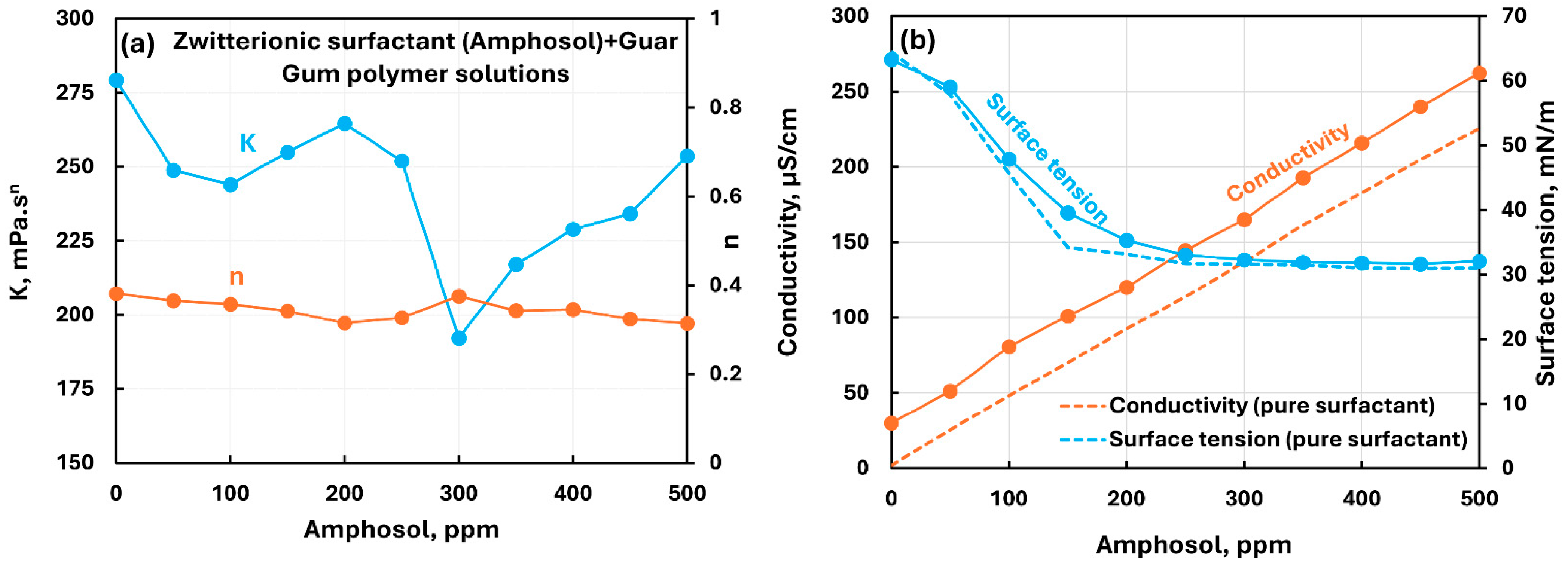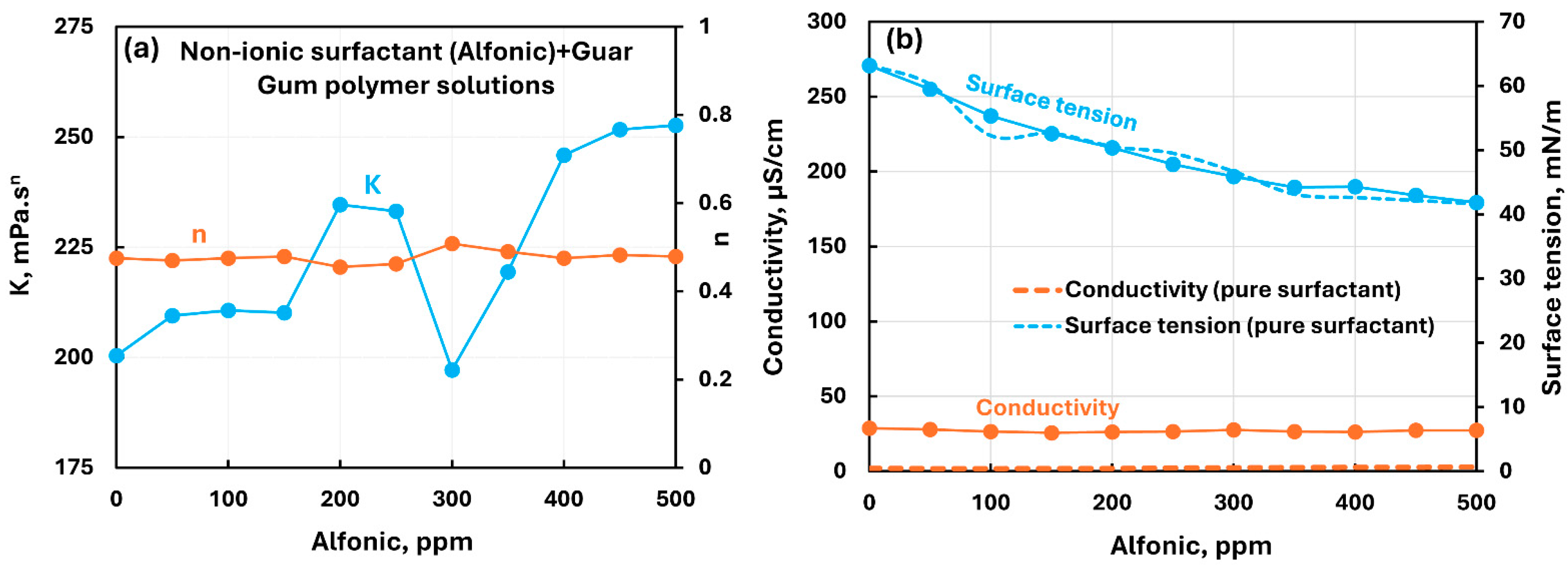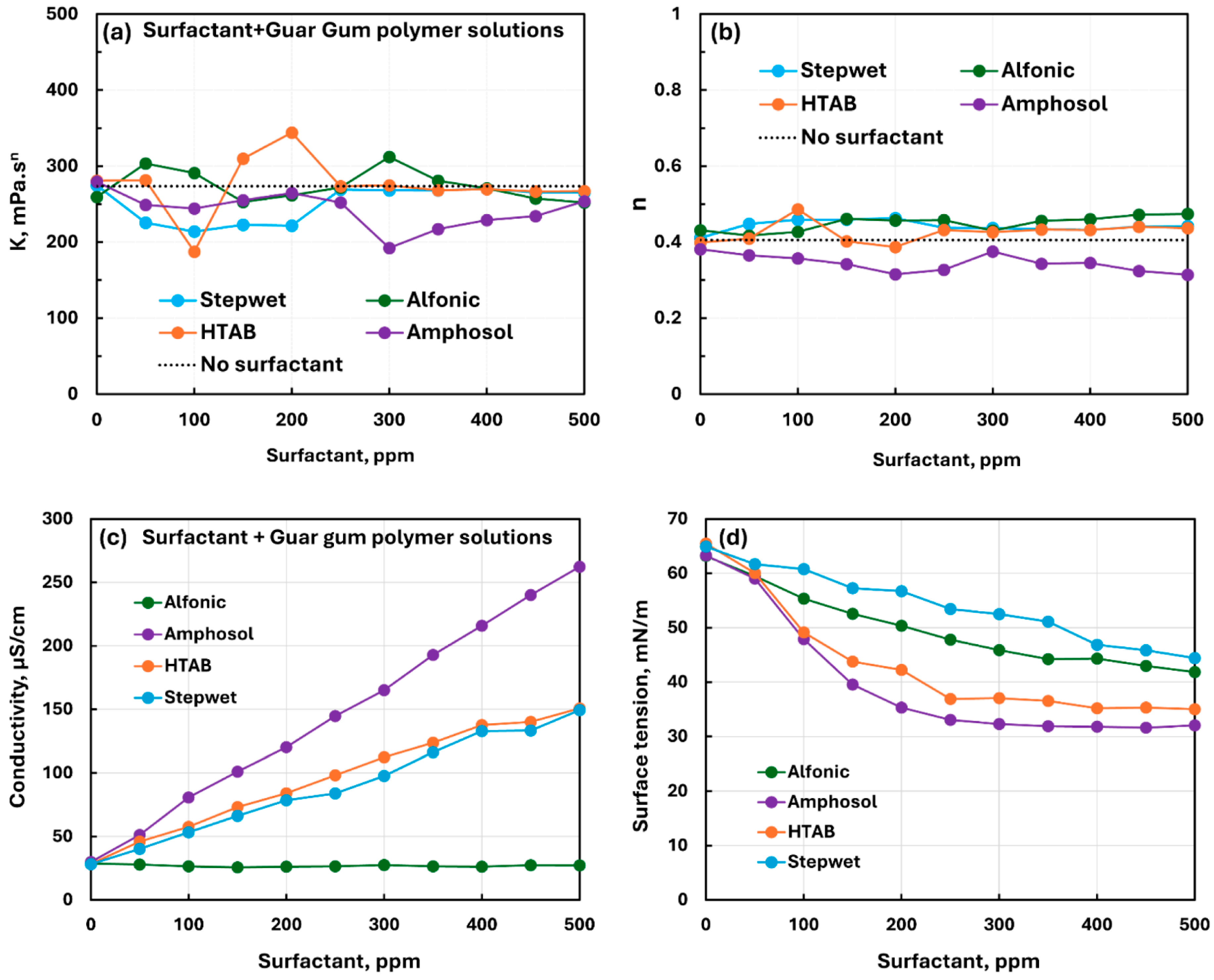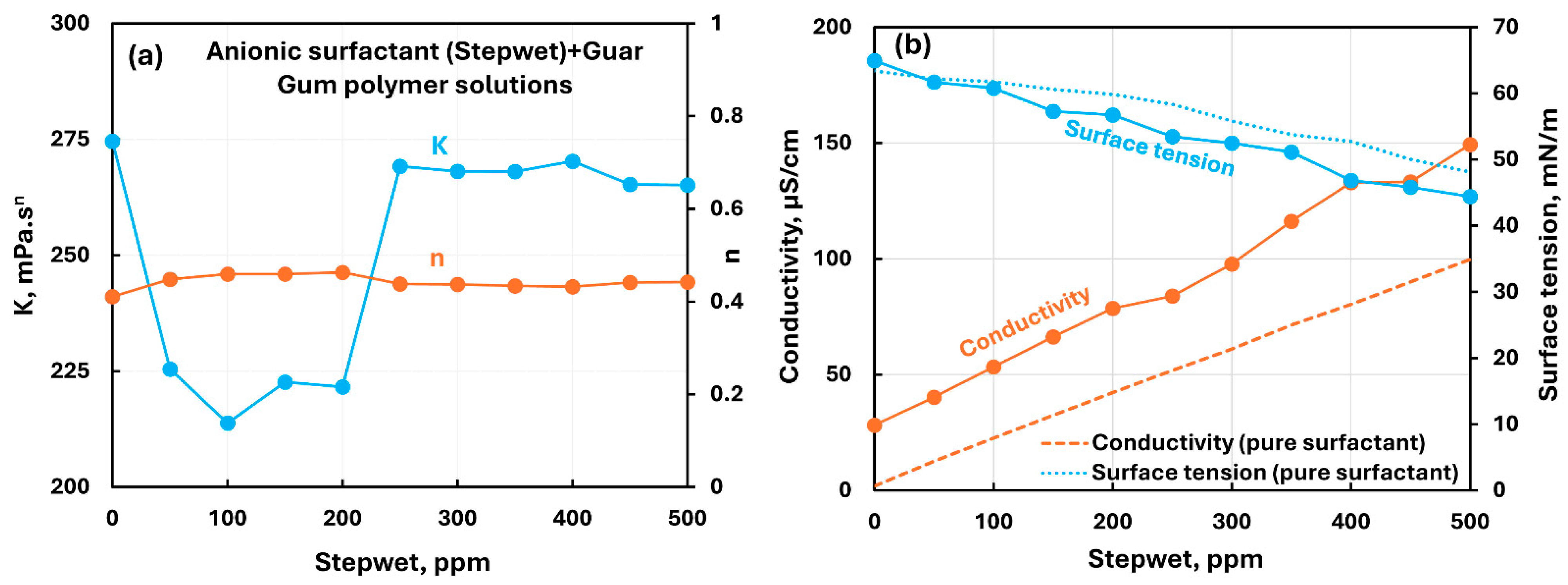 Nonionic Guar Gum | Anionic (Stepwet) | S− P0 | Moderate hydrophobic interaction between surfactant and polymer; consistency decreases; solution surface tension lower than pure surfactant; surfactant–polymer complexes formed are more surface-active than pure surfactant. |