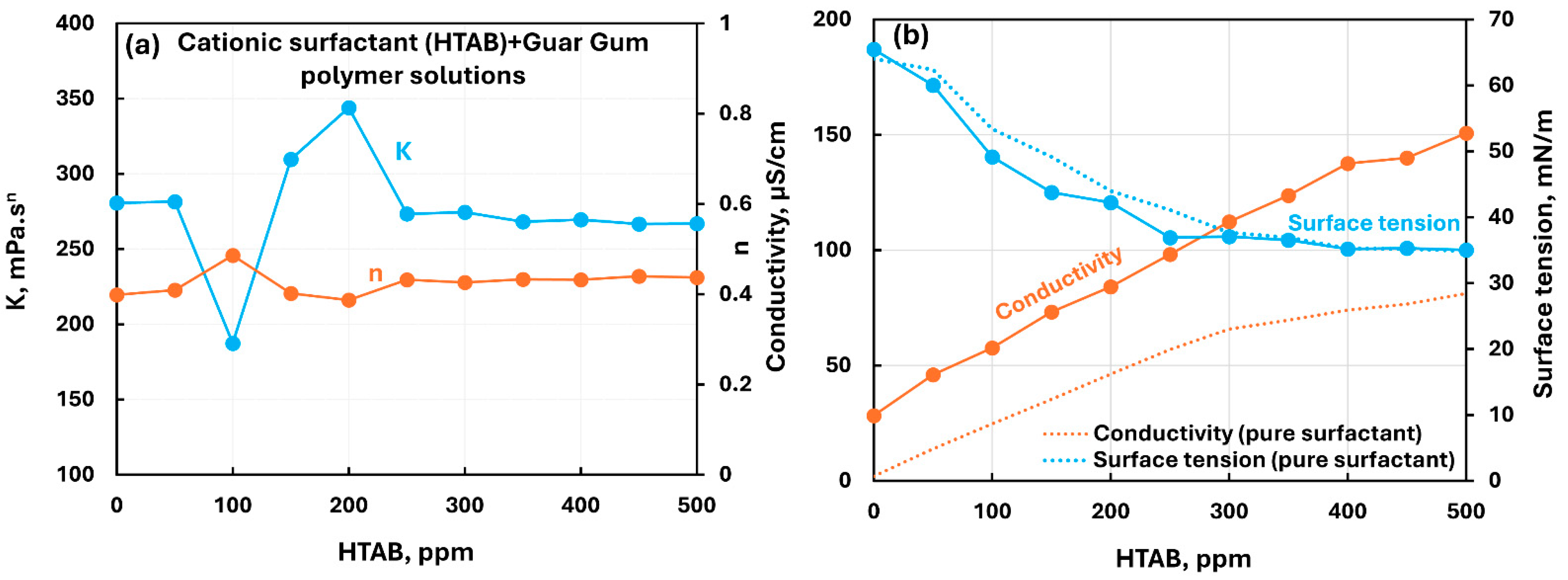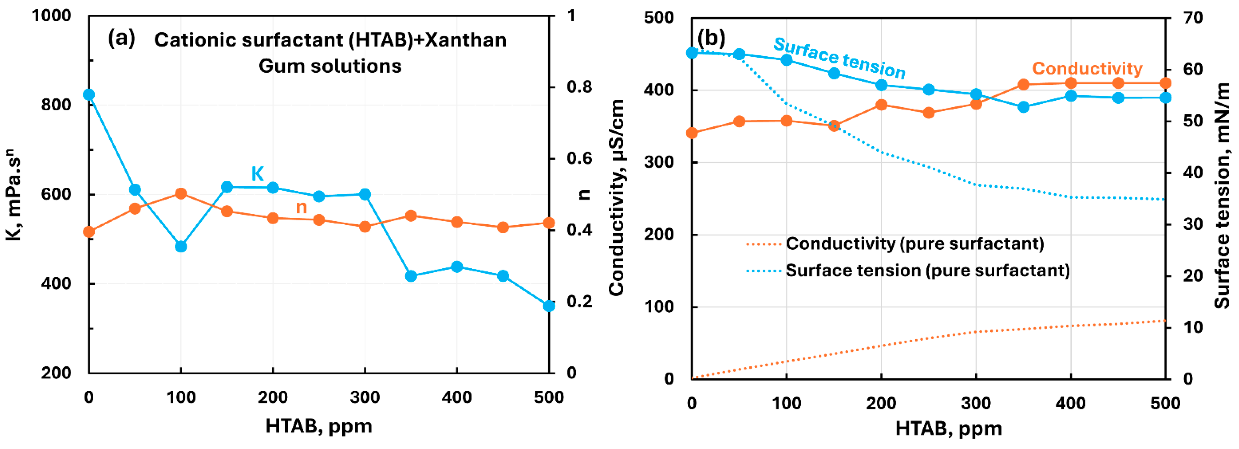Anionic Xanthan Gum | Cationic (HTAB) | S+ P− | Strong electrostatic interaction between surfactant and polymer; consistency index decreases substantially; polymer–surfactant solution is less surface-active than pure surfactant due to migration of surfactant from solution to polymer. |